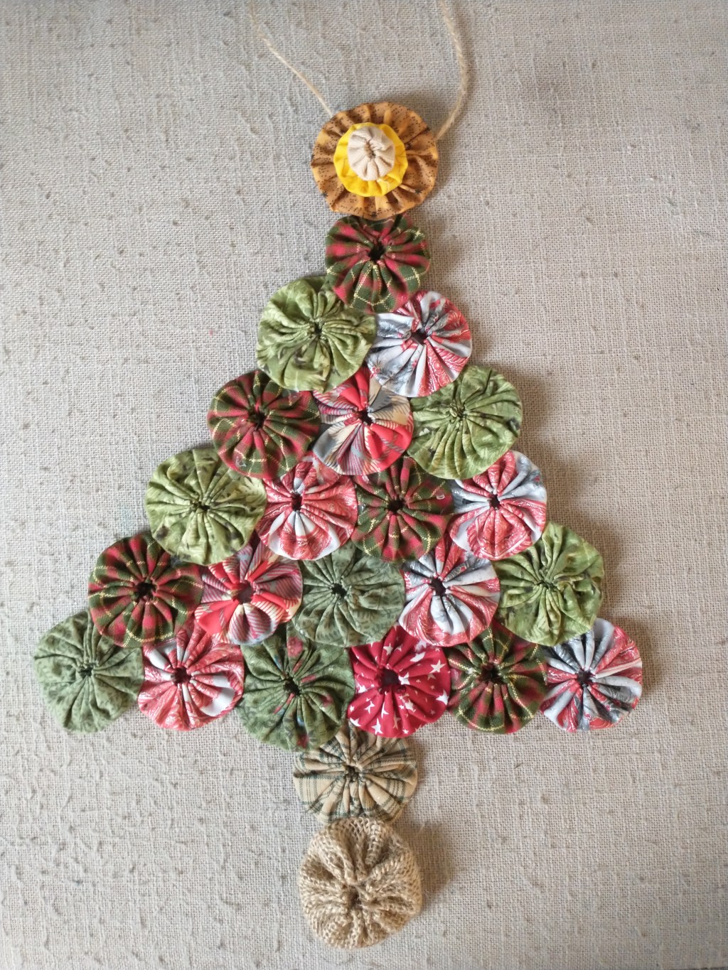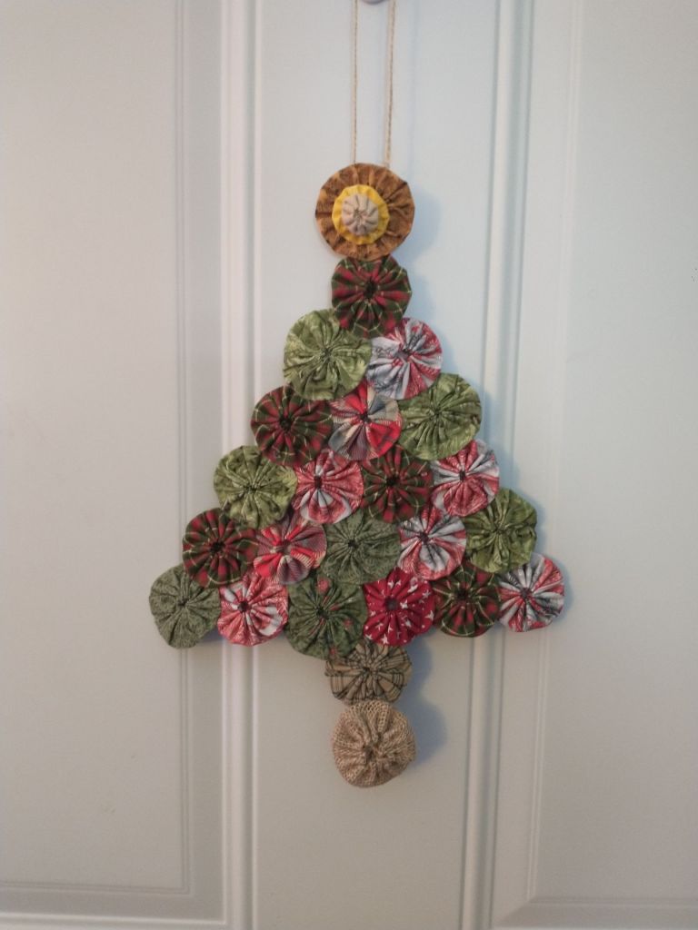 I needed something to hang on the inside of our front door, and this was too cute to not try! Fabric yo-yos, all large size except for the star, which is one large, one medium and one small. I hot glued them together, and hot glued a twine loop to the back. What are you all making?