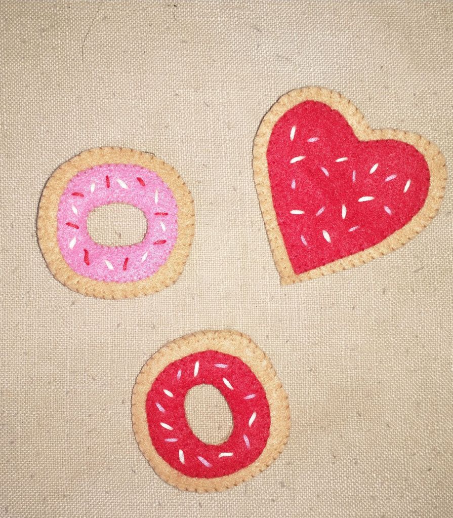 Happy Valentine’s Day! I dug out this pattern from my stash for these cute felt “cookies” that I glued magnets to. This pattern was originally free on the Better Homes and Gardens site, but I couldn’t find it online today.